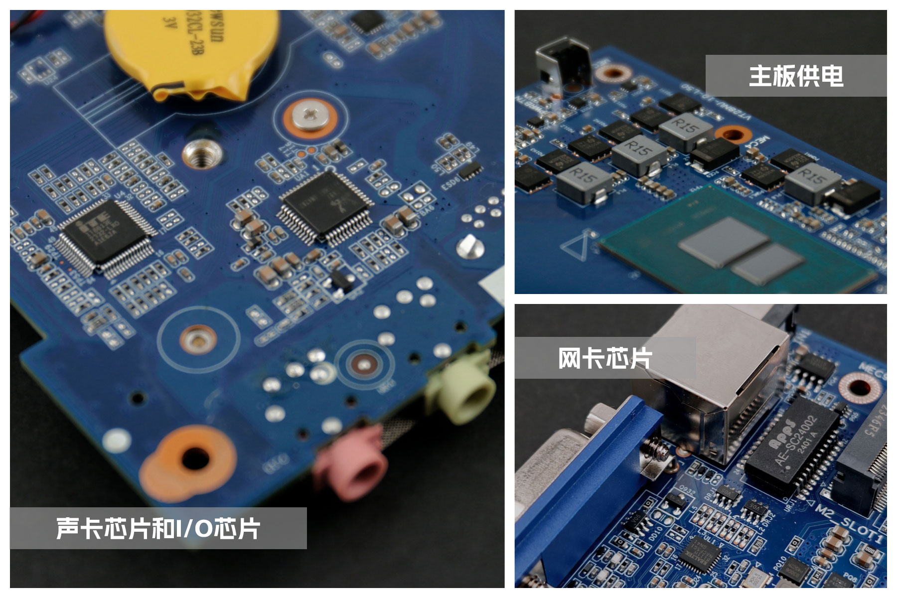 沐鸣桌面云终端Y-BOX S2主板采用的是3+1相供电,在主板两侧的接口附近,都分布了相关的芯片。在千兆网口附近有1个网卡芯片RTL 8111H,在主板背面的音频接口附近可以看到一个经典的“小螃蟹”ALC897 声卡芯片,声卡芯片附近有一个I/0 芯片HE8613E-LX。