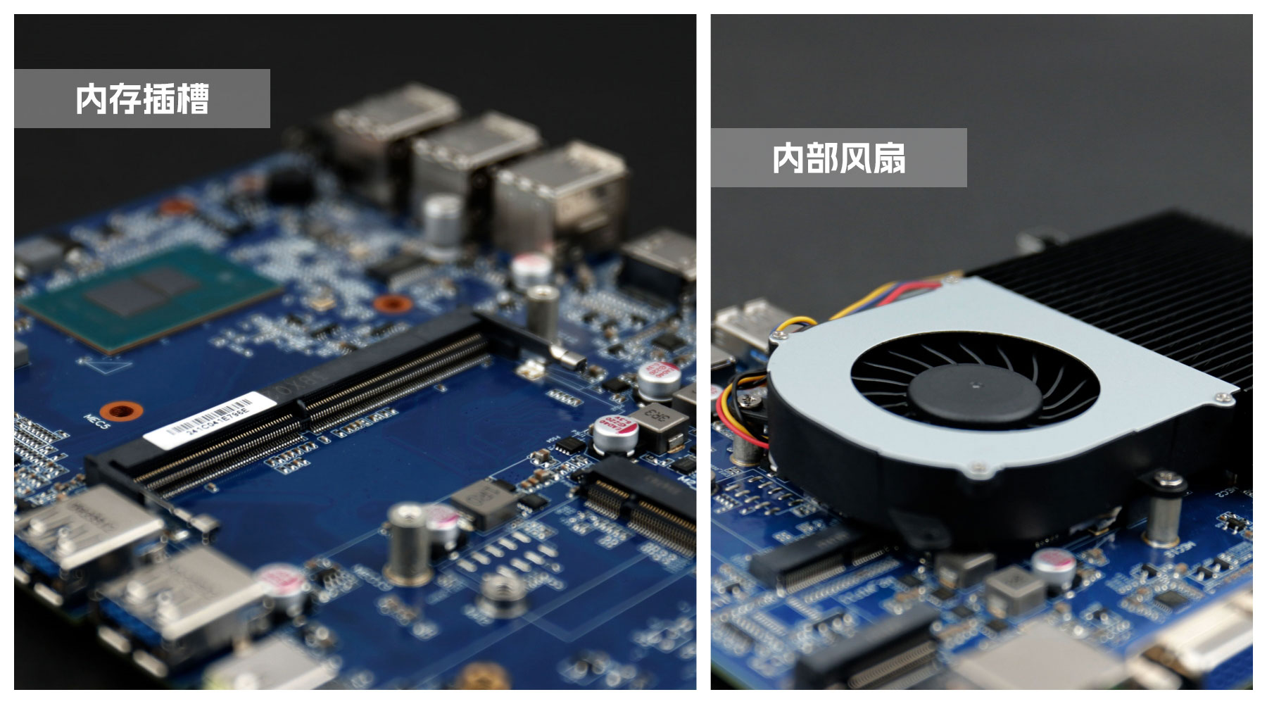 沐鸣桌面云终端Y-BOX S2主板中部是内存插槽,采用单通道笔记本内存槽设计,最大支持容量可达32GB,最高支持DDR4-3200MHz频率,横插的形式可以减少主板的占用体积,使整体机身更紧凑,内存顶部的风扇起到高效散热的作用。