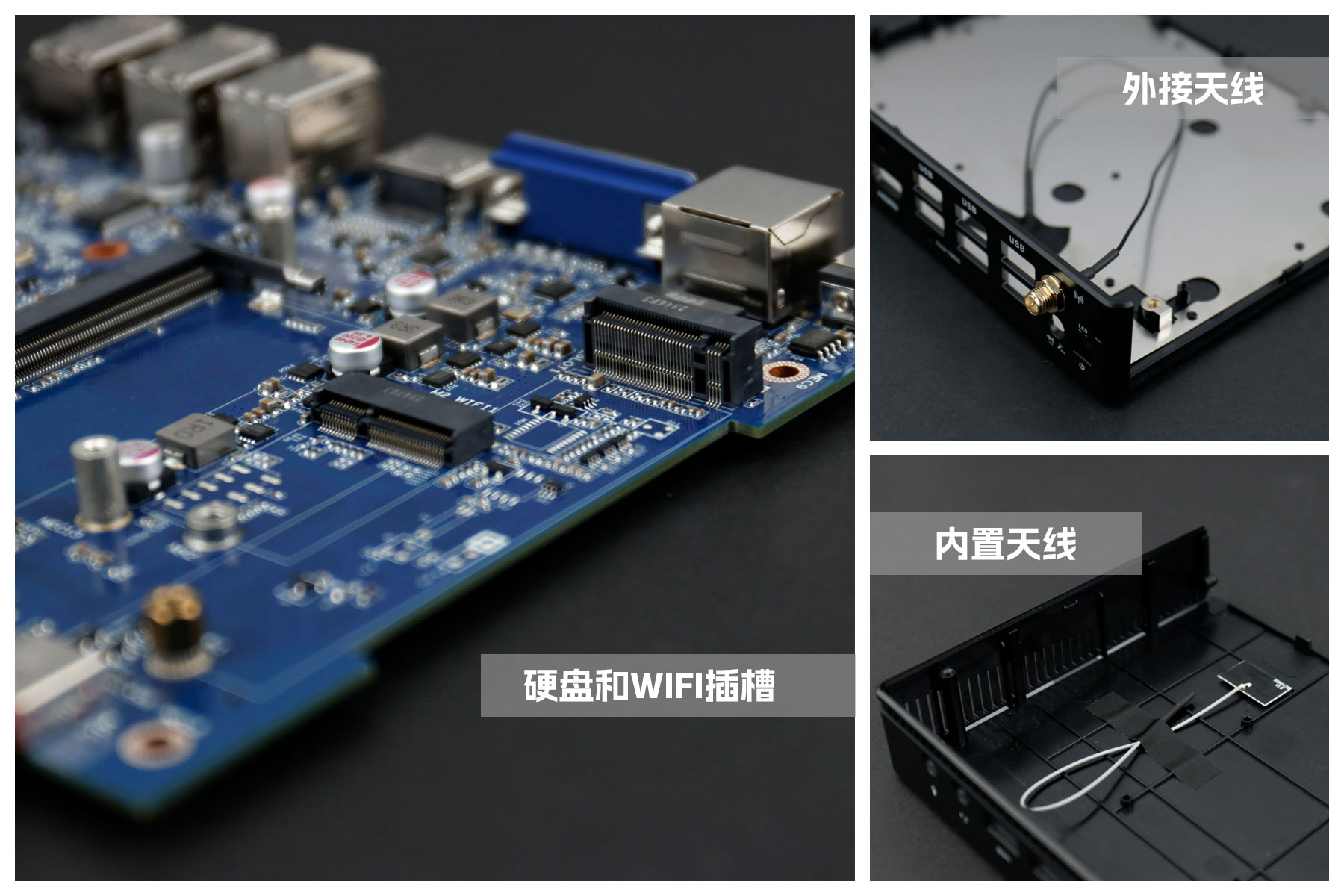 沐鸣桌面云终端Y-BOX S2主板上配备了 1个 M.2 固态硬盘位,接口规格为 PCIe3.0 标准,匹配标准的 2280 规格硬盘。一侧还有一个M.2接口,匹配2230长度的WIFI/BT模块插槽,WiFi模块可以连接的是外接天线,增强信号,同时也可以内接天线,灵活应用,支持Wi-Fi 5/6/6E网络。