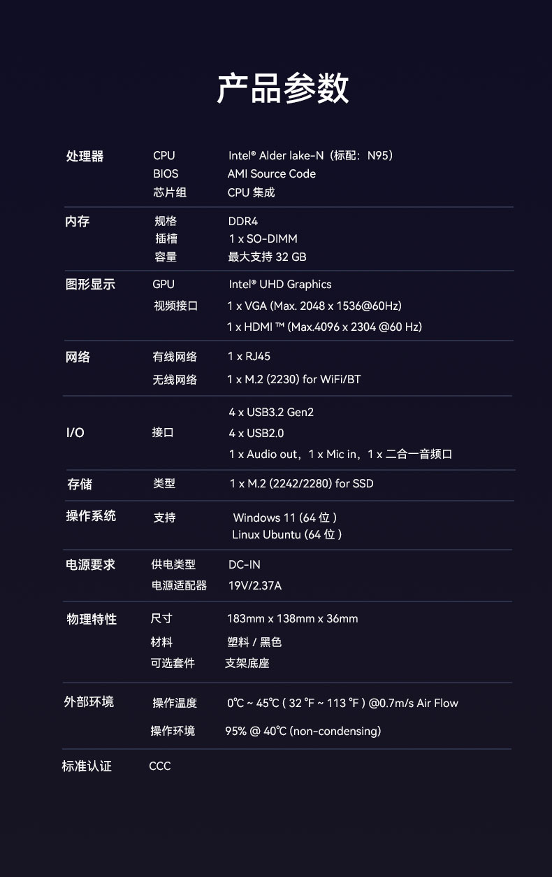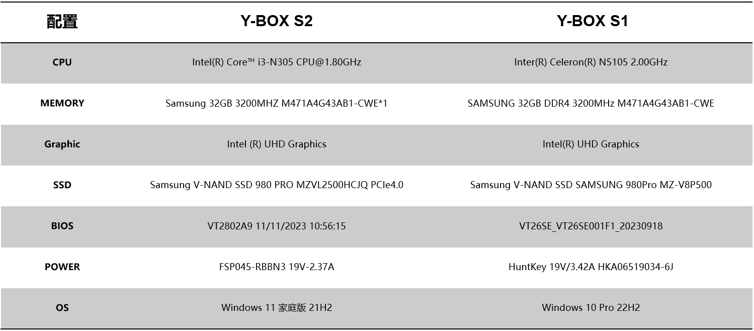 针对桌面云终端Y-BOX S2的测试项目中,最值得关注的是性能测试的跑分数据和稳定性测试内容,这能直观影响主机在使用过程中的稳定性和用户的使用体验。针对性能测试,沐鸣选择了将Y-BOX S2与前一款更迭产品Y-BOX S1进行对比分析,Y-BOX S2支持Intel® Alder lake-N处理器,Y-BOX S1支持Intel® Jasper Lake,并分别选取了以下配置: