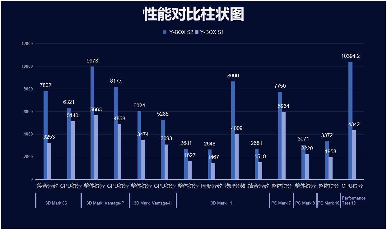 沐鸣来具体看看各个测试项目的跑分情况,测试项目包括显示性能测试、系统性能测试、CPU性能测试,分别用3D Mark、PC Mark以及Performance 10等系列不同软件的跑分数据,针对两款主板的跑分情况可以看出,沐鸣桌面云终端Y-BOX S2的数据在各项性能上都得到了大幅度提升,柱状图能更直观地体现出数据的变化,沐鸣将针对具体的几项数据来进行详细分析。