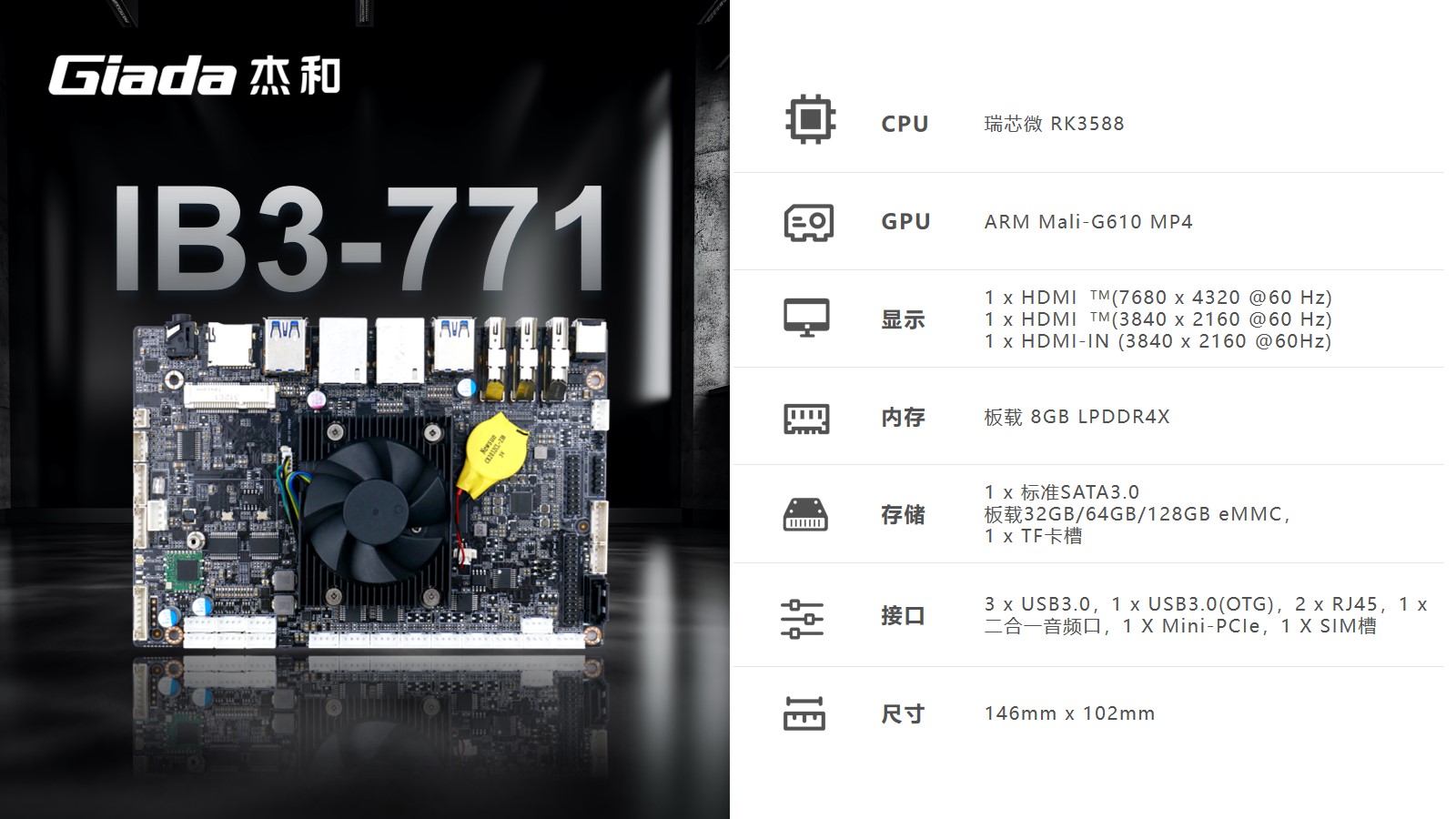 沐鸣工业级ARM主板IB3-771采用瑞芯微RK3588处理器,内置G610 MP4 GPU,拥有6 TOPS算力的NPU,支持8K视频硬件解码编码及多摄像头输入,支持eDP/DP/ HDMI2.1/MIPI 多种显示接口。