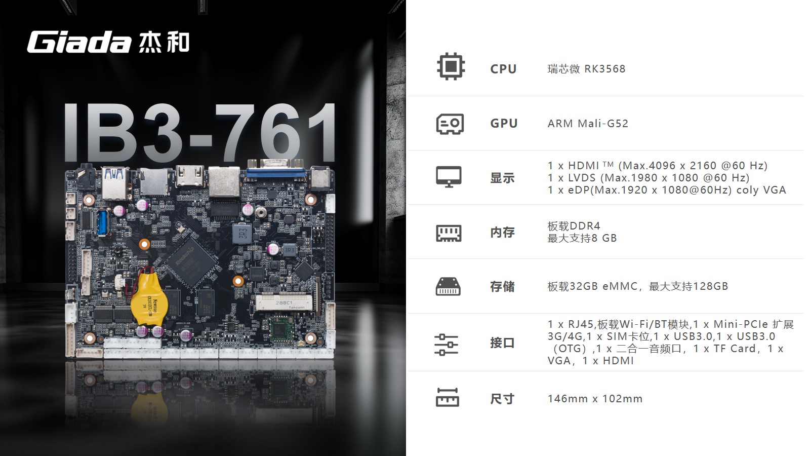 沐鸣工业级ARM主板IB3-761基于瑞芯微RK3568四核64位处理器开发。内置1TOPS算力的NPU,满足轻量级端侧AI计算应用。