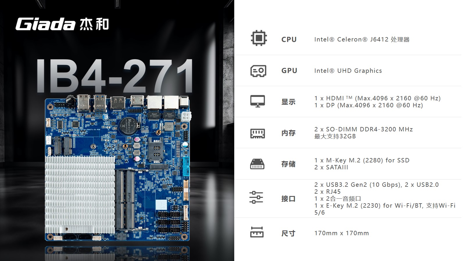 沐鸣IB4-271搭载的是Intel® Celeron® J6412处理器,Elkhart Lake平台在单线程性能上提升了1.7倍,在多线程性能方面提升了1.5倍,具有三个显示输出,包括DP、HDMI 和 LVDS 端口,能够为工业的多媒体应用、标牌显示和数字菜单提供足够的灵活性。