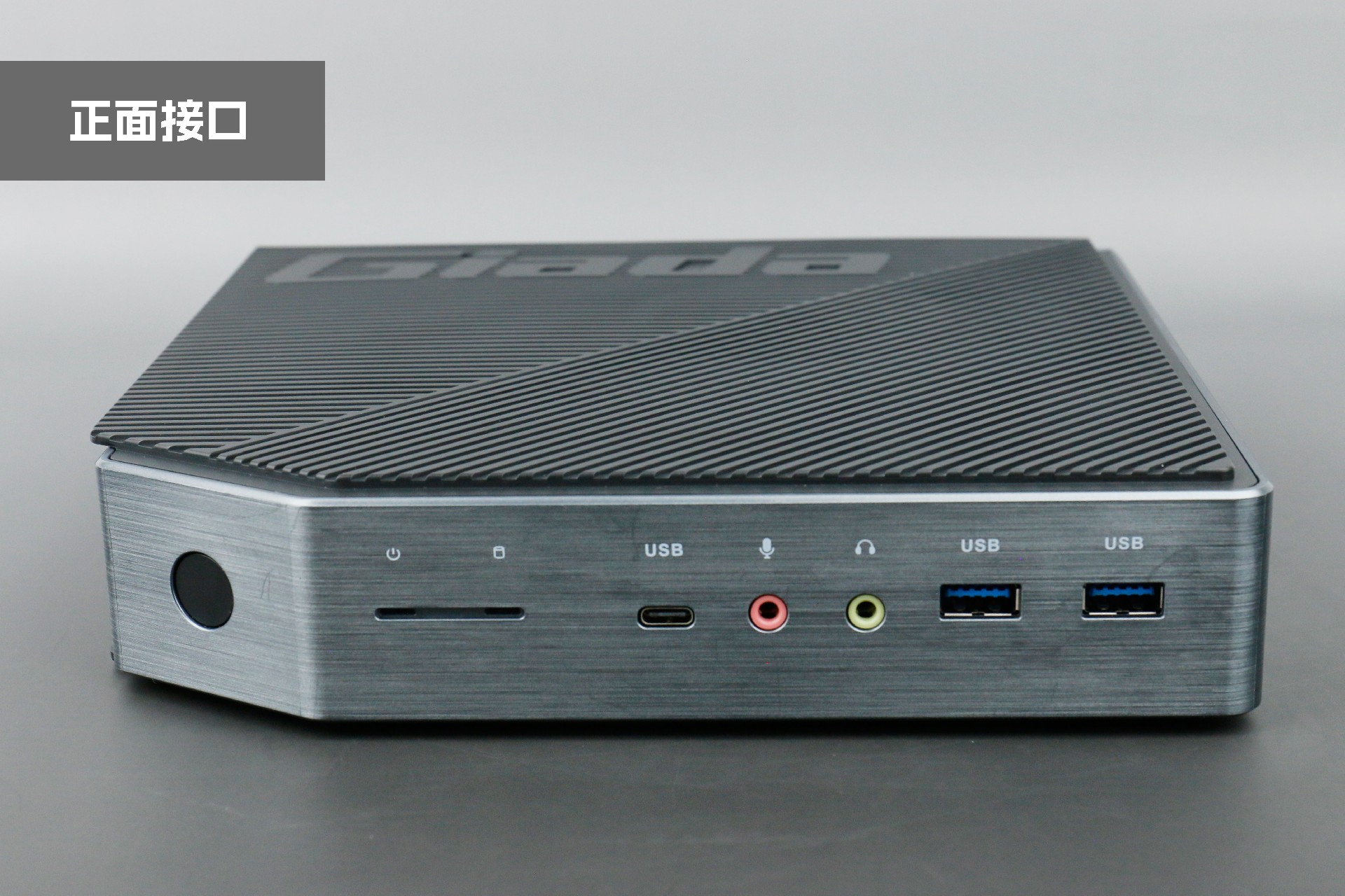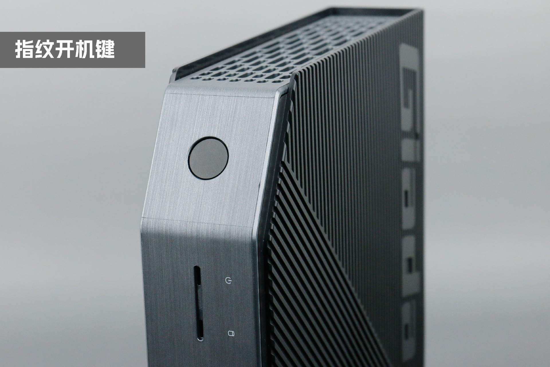 打开沐鸣桌面云终端Y-BOX P3,你会发现它的结构并不是常见的四方体设计,而是在转角处好似被切割开一个角,切割出来的面积为指纹识别开机键。它的外观为优雅的银灰配色,机身正面厚重感十足,顶部依然沿用黑色哑光栅格并延伸至整机背面,磨砂塑胶材质壳,印刻沐鸣Giada品牌名;其他三面则为银灰色,两侧是蜂窝式通风口设计。