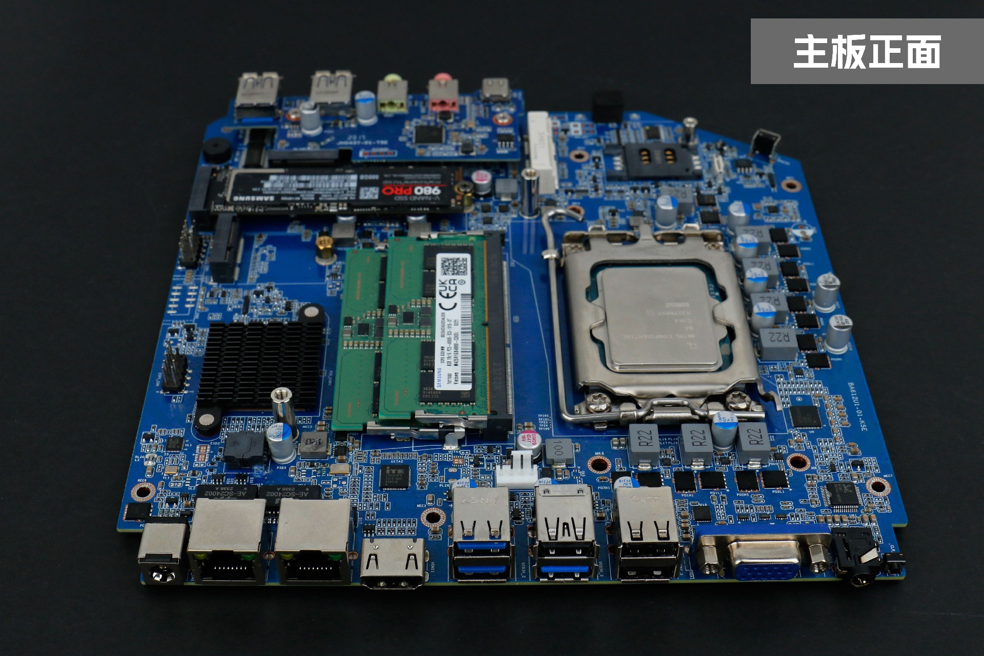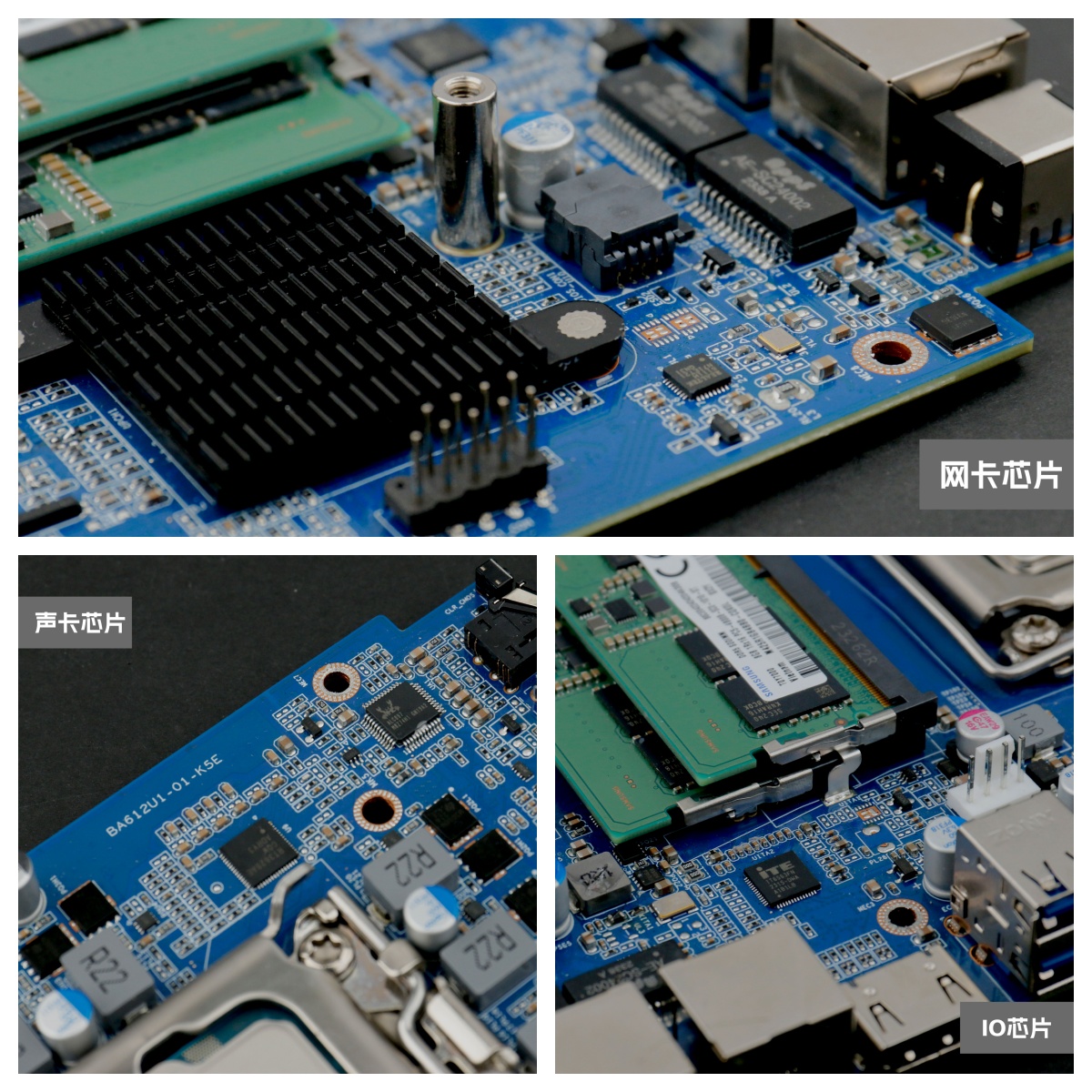 沐鸣桌面云终端Y-BOX P3主板采用的是6相供电,为H610入门级芯片组,CPU附近都分布了相关的芯片,在千兆网口附近有2个网卡芯片RTL 8111H,在主板背面的音频接口附近可以看到1个经典的“小螃蟹”ALC897 声卡芯片,声卡芯片附近有一个I/0 芯片ITE8613E-LX。