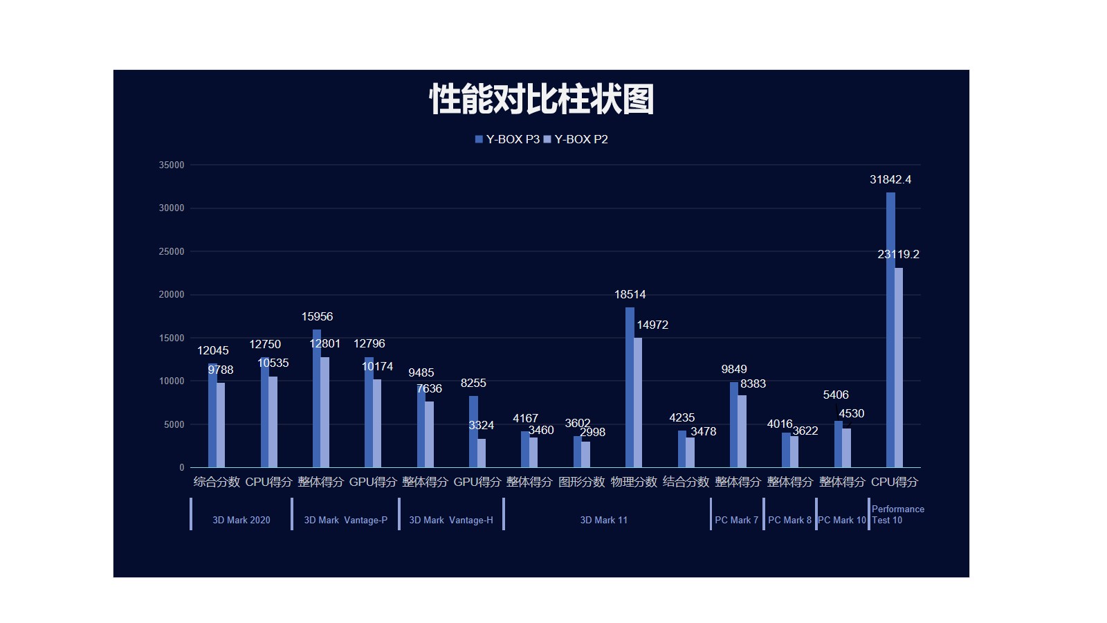沐鸣来具体看看各个测试项目的跑分情况,沐鸣分别用3D Mark、PC Mark以及Performance 10等不同系列不同软件进行跑分,测试项目涵盖显示性能测试、系统性能测试、CPU性能测试等。通过下面的表格及柱状图可以看出,沐鸣桌面云终端Y-BOX P3的数据在各项性能上都得到了大幅度提升。