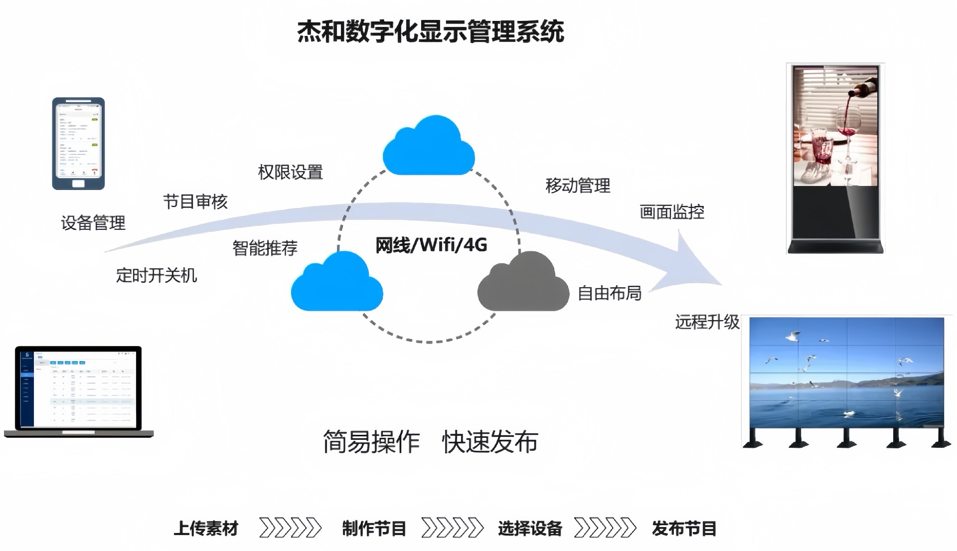 目前沐鸣科技GDSM-ES系统覆盖市场上多形态网络智能显示终端,满足行业全产品业态需求,如广告机、LED显示屏、LCD拼接屏 、普通液晶电视等各种显示终端,广泛用于广告宣传、通知公告、指示引导。