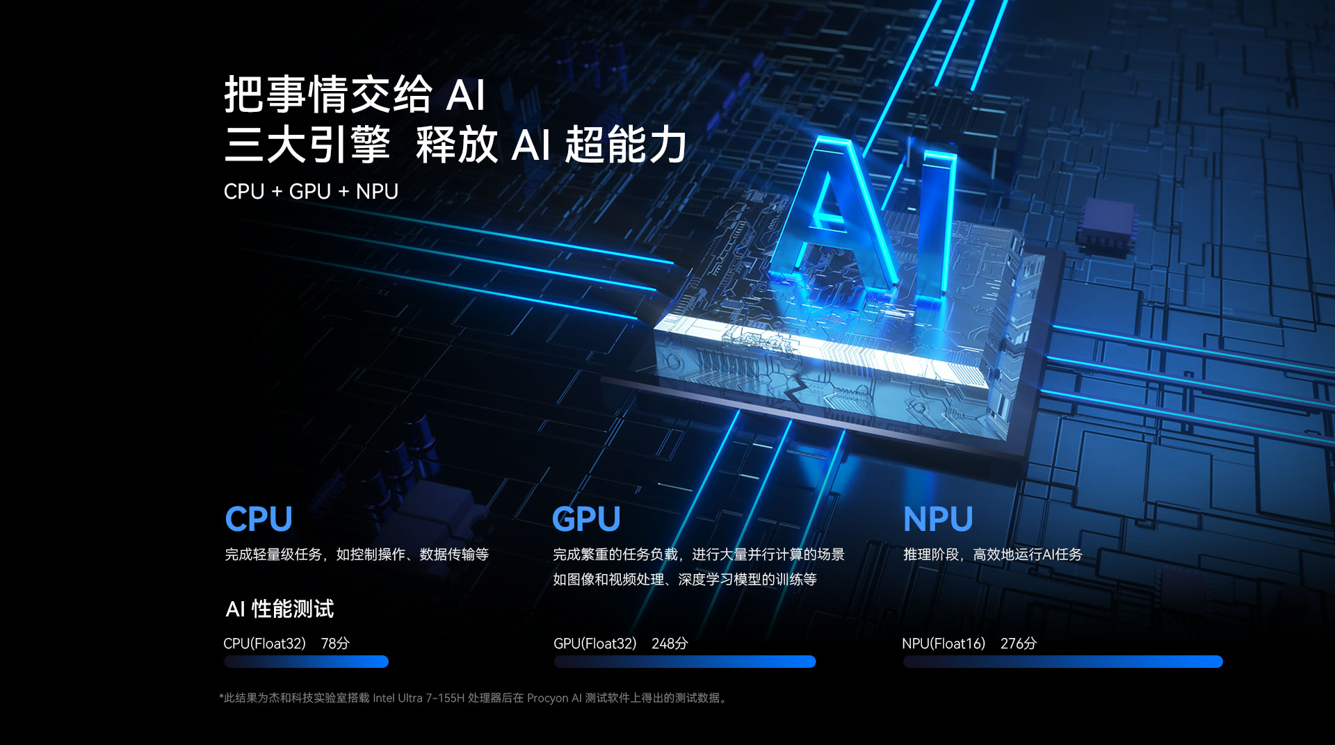 沐鸣科技N601搭载了Intel® Core™ Ultra处理器,可选配Ultra 5- 125H或Ultra 7-155H,全新架构拥有CPU、GPU 和NPU配置。在沐鸣科技实验室里,沐鸣专门用 Procyon AI 这款 AI 性能测试软件对搭载了 Ultra 7-155H 处理器的 N601 进行了测试。最后测试结果显示,N601的CPU分数为78分,GPU 分数为248分,NPU分数为276分,这意味着N601在AI处理方面具有显著优势,能够高效地处理复杂的神经网络计算任务。