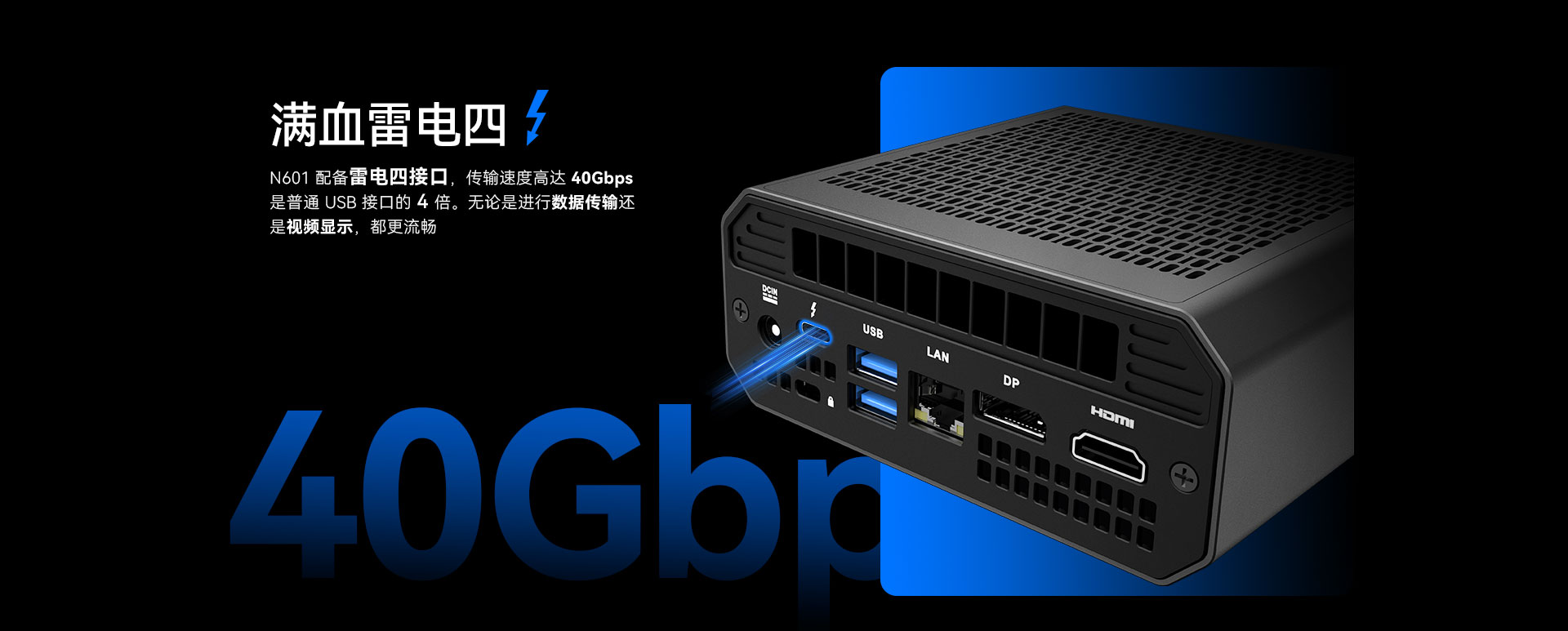 沐鸣科技N601配备雷电四接口,传输速度高达40Gbps,用户可通过该接口连接2块屏幕。还可通过HDMI2.1接口,DP1.4接口再连接两块屏幕,实现四屏异显。雷电四还可以连接外设,如鼠标、键盘、控制器和耳机等。