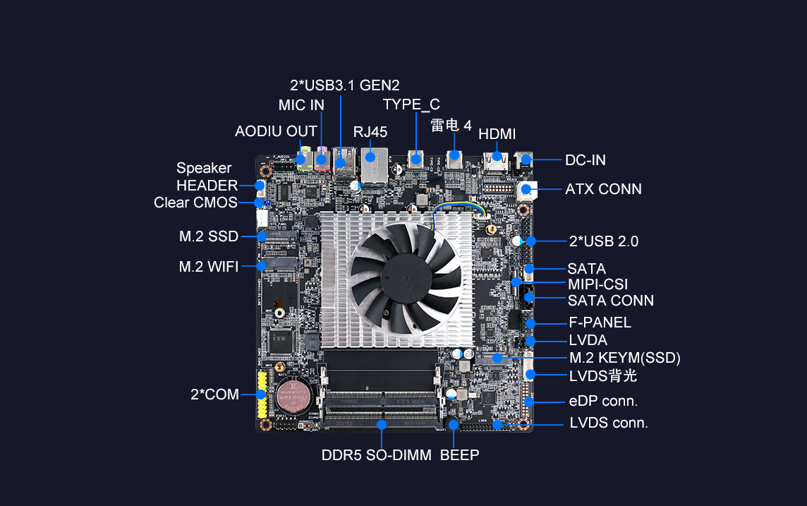 CB4-411支持英特尔Ultra5、Ultra7、Ultra9H系列处理器,支持本地AI计算,拥有34TOPS算力、DDR5高速内存、雷电4接口、2.5 GbE 以太网等功能特性。还在主板功能上进行改良,增加一键静音、一键熄屏、一键音量加减的功能。