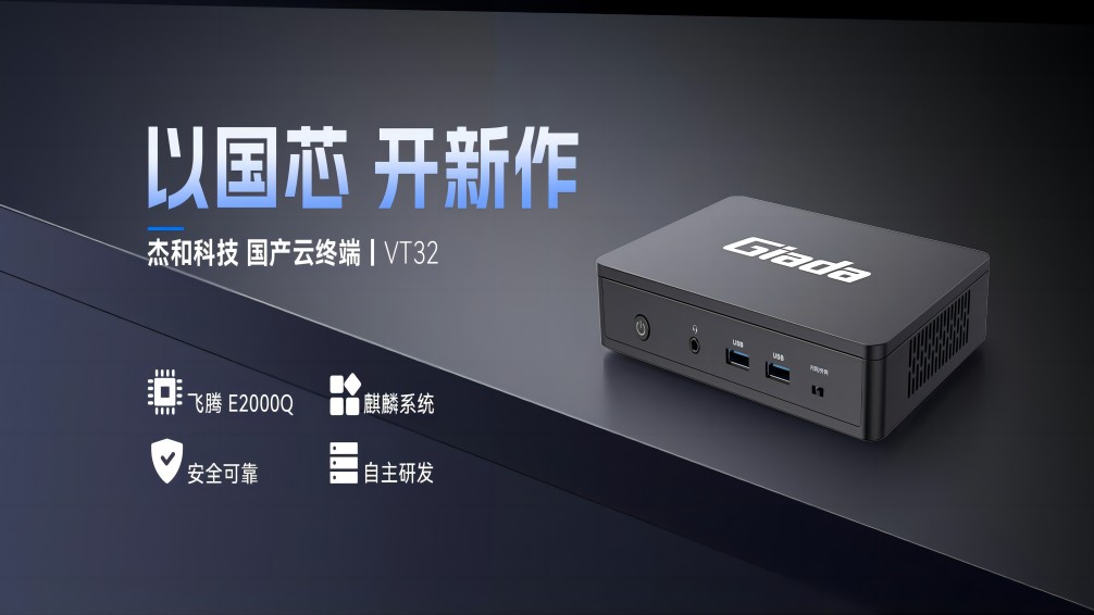 沐鸣科技推出的国产化云终端VT32,这款产品采用国产飞腾腾珑E2000Q四核处理器,主频达2.0GHz深度适配银河麒麟V10系统,麒麟V10系统不仅能满足金融办公、政府办公对于数据安全与隐私保护的要求,还支持多样化部署与管理。