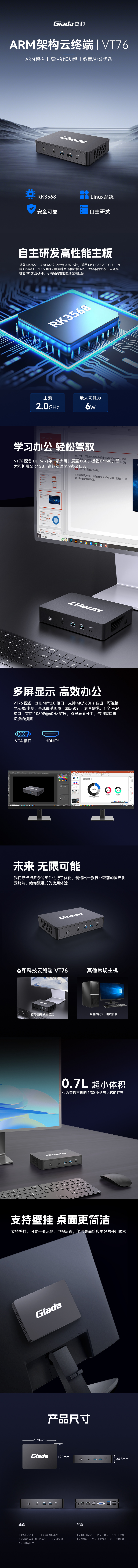 沐鸣科技ARM云终端——VT76,搭载瑞芯微RK3576 4核64位处理器,2.0GHz主频,6W功耗。
