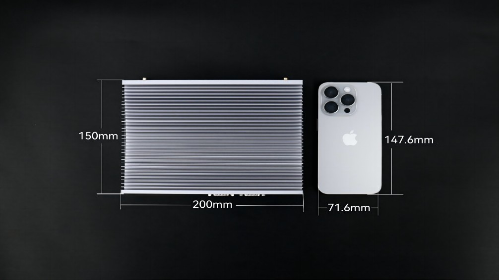没有了风扇这一部件,体积也更为小巧,能轻松嵌入各类设备或狭小空间,完美贴合特定场景需求,例如:沐鸣AE613,其三围尺寸是200mm x 150mm x 50mm,与iphone15的尺寸对比,宽度仅比其高度多2.4毫米,体积仅有1.5L。