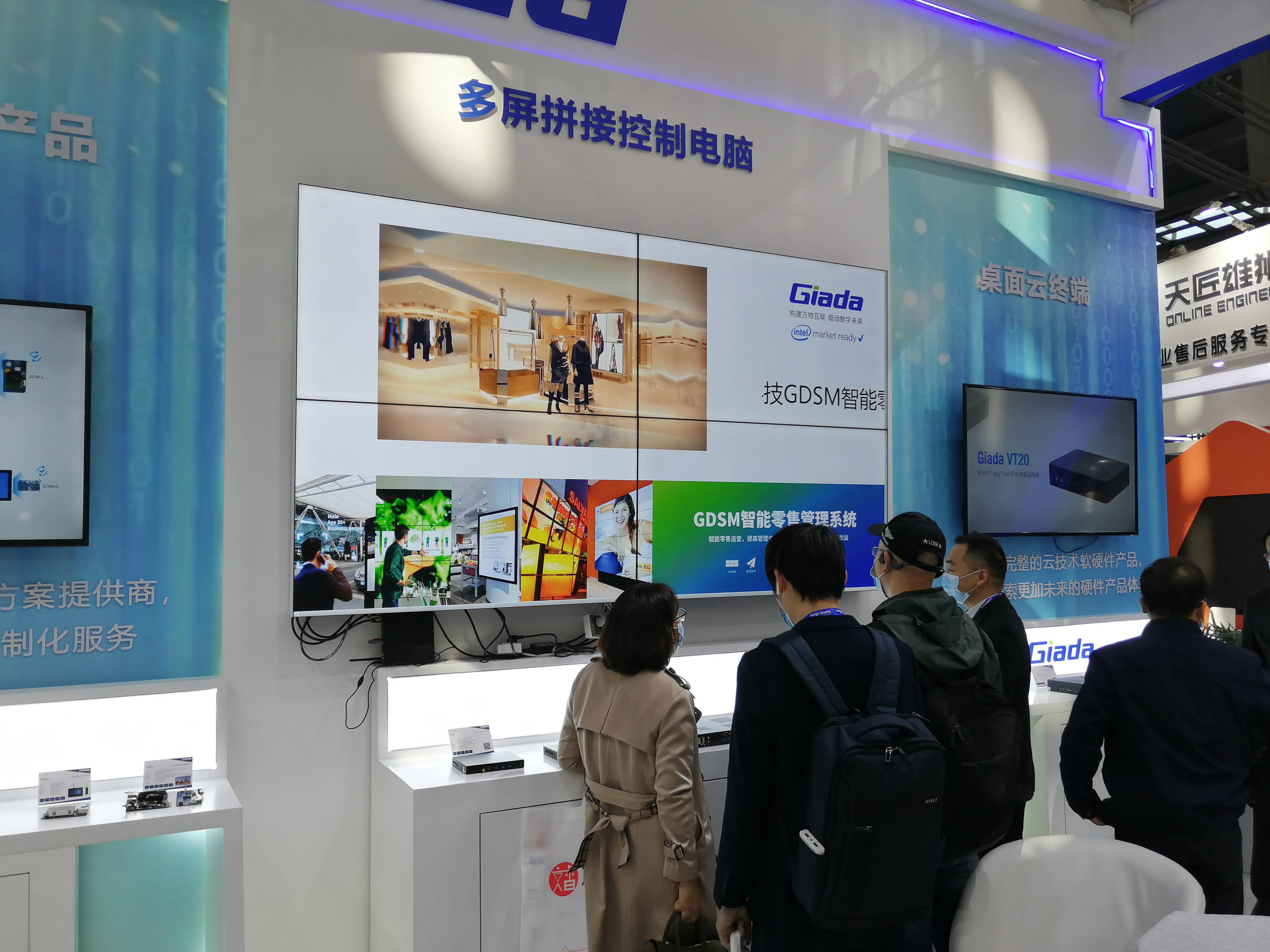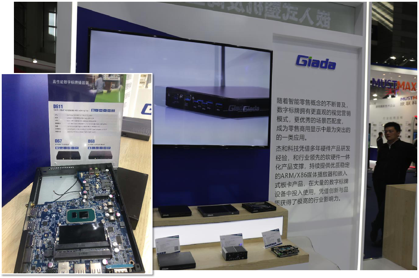 步入沐鸣科技展位,首先呈现的是沐鸣科技近年的商用显示ARM产品集和GDSM广告精准推送演示。沐鸣科技DN系列媒体播放器分别使用了瑞芯微RK3288、RK3328和RK3399三款核心芯片;全部采用116mm*107mm*30mm的紧凑外观设计,轻便灵活;搭载RK3399的DN74媒体播放盒具备双屏4K异显输出能力,DN75在DN74的基础上额外扩展了HDMI-in视频输入接口,支持画中画或投屏显示。沐鸣科技现场布署的所有单个屏幕都由DN系列媒体播放器作为信号源,GDSM智能零售管理系统下发的广告信息通过后台推送,再现了零售场景下如何管理多个分散布署的广告屏。