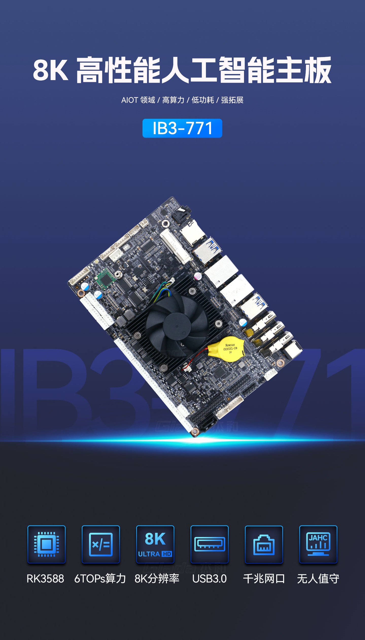 沐鸣科技IB3-771采用瑞芯微全新旗舰级芯片RK3588,搭载八核64位处理器,集成ARM Mali-G610 MP4 GPU,高算力、低功耗、具备强大的视觉处理能力;性能强悍的RK3588内置AI加速NPU,提供6TOPs算力,支持主流深度学习框架,为各类AIoT应用场景提供更优的性能表现。