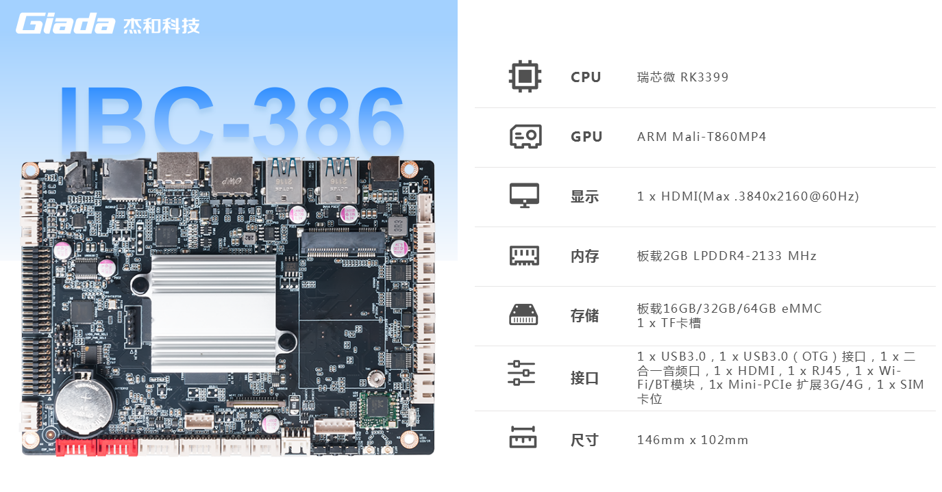 沐鸣科技IBC-386是一款基于ARM架构的3.5英寸主板,采用瑞芯微RK3399处理器(双Cortex-A72大核+四 Cortex-A53小核)六核 64 位CPU。RK3399作为瑞芯微超级扩展全能型旗舰级芯片,GPU采用四核ARM新一代高端图像处理器Mali-T860MP4,具备高性能、低功耗、强大的视觉处理能力的特点。IBC-386板载2GB LPDDR4-2133 MHz内存,板载16GB/32GB/64GB eMMC,支持1x TF卡槽,多种形式轻松扩展存储容量。