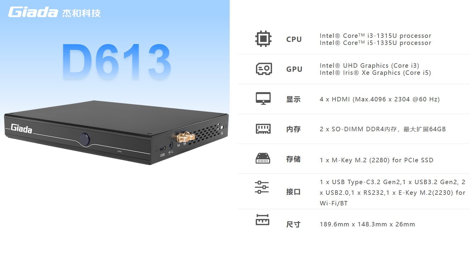 沐鸣数字标牌D613搭载Intel RaptorLake Corei3-1315U/i5-1335U处理器,可以同时连接4个4K显示器,支持4K分辨率编码解码,还支持5G蜂窝网络,速度比4G LTE快10倍。