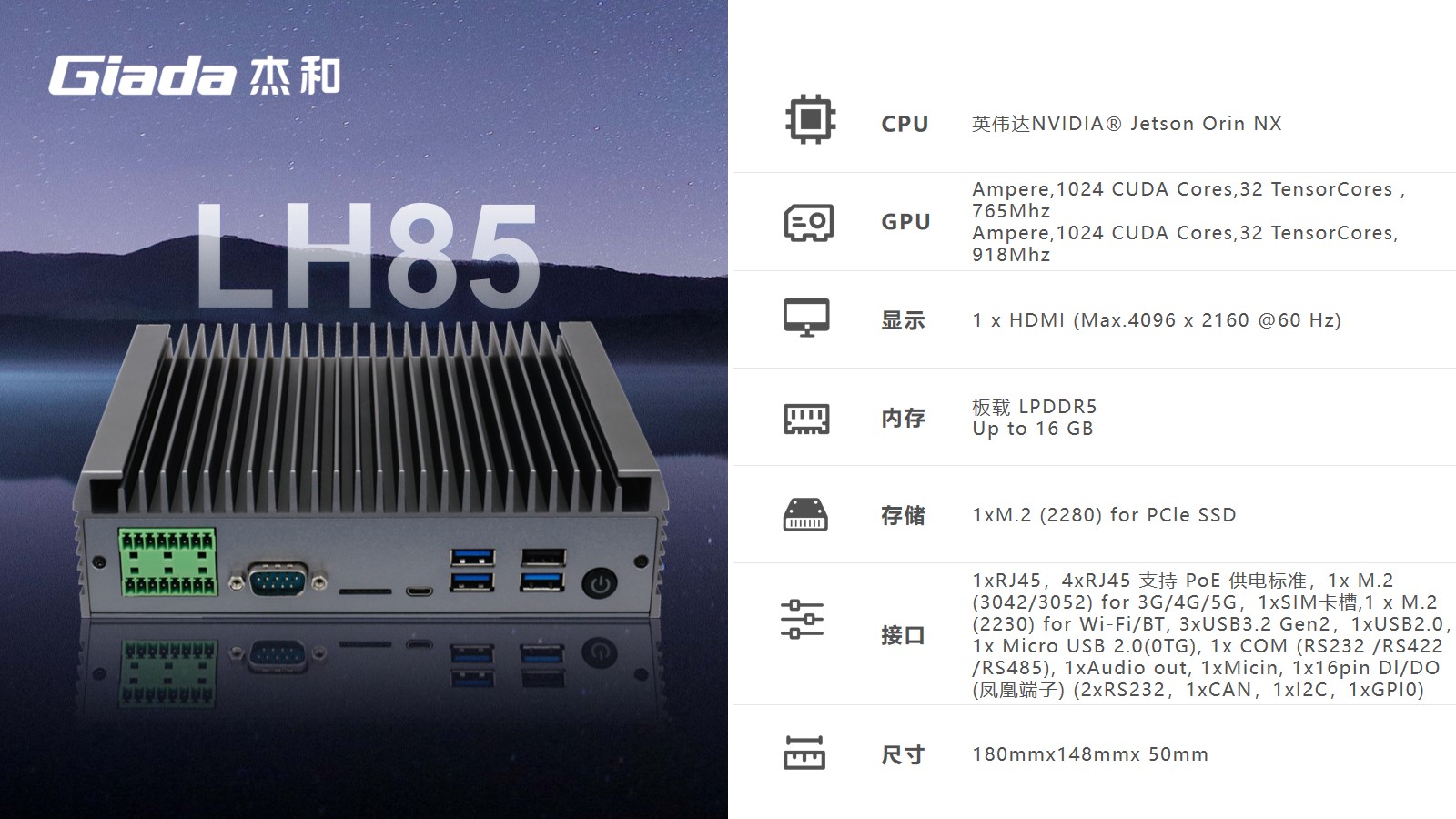 沐鸣科技AI边缘计算LH85,拥有100TOPS超强算力,能为工业控制领域客户的AI应用提供强大的算力支持和充足的通信、控制接口保障,可广泛应用于智能制造、机器视觉、AGV、智慧城市等领域。