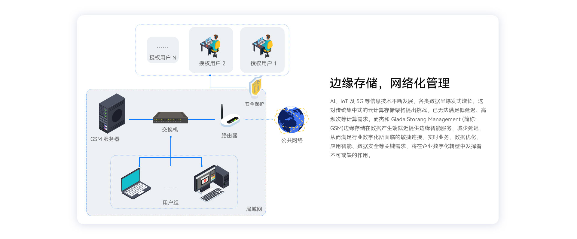 实现数据存储和业务应用的一体化集成,协助用户在边缘侧实现数据的存储、管理和应用,具备病毒防护、数据加密备份、自动清除潜在隐患等功能,同时有效降低对云端服务器和网络带宽的依赖,使用户数据存储更安全。